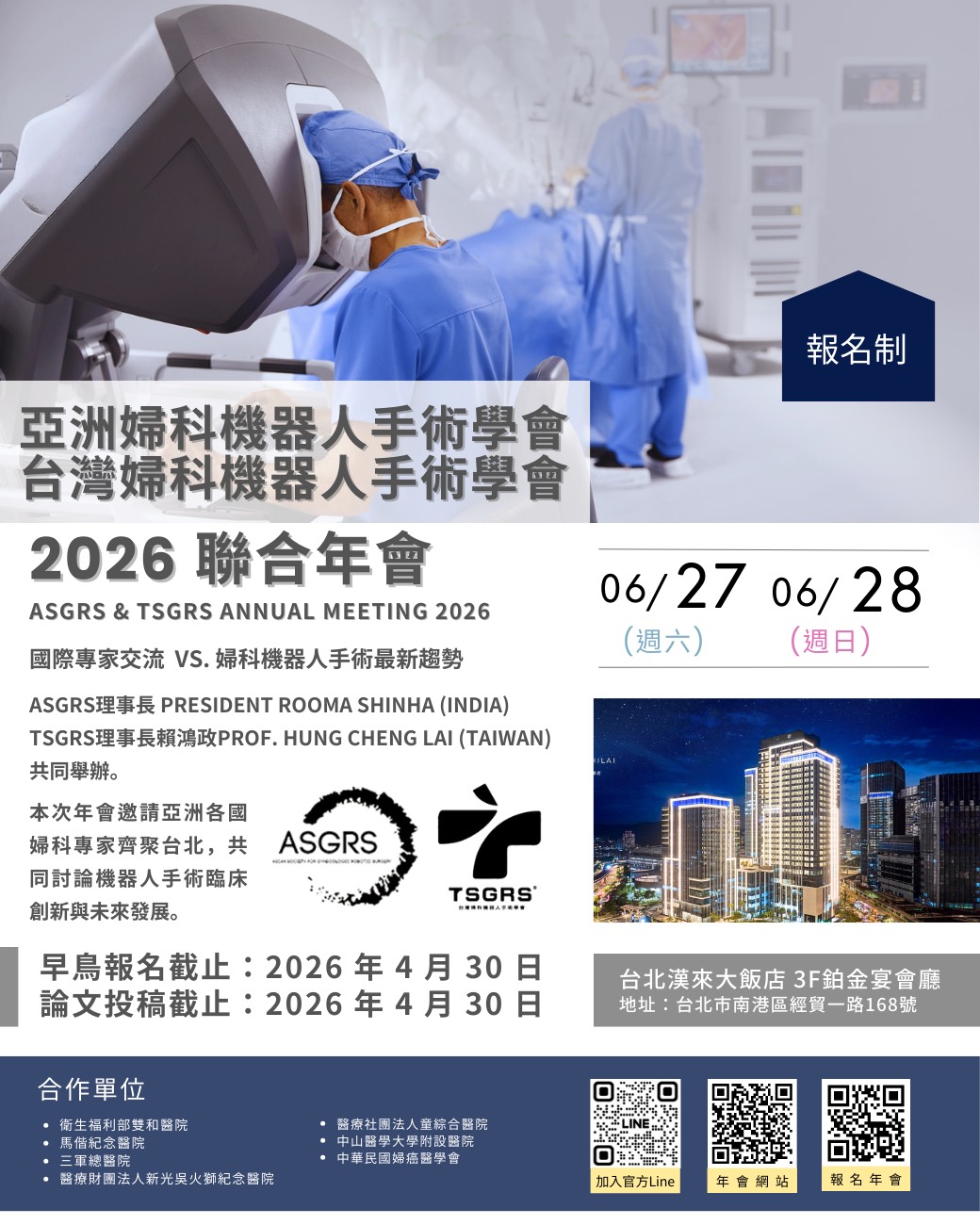 非常榮幸與欣喜地歡迎您參加 2026 年亞洲婦科機器人手術學會與台灣婦科機器人手術學會聯合年會